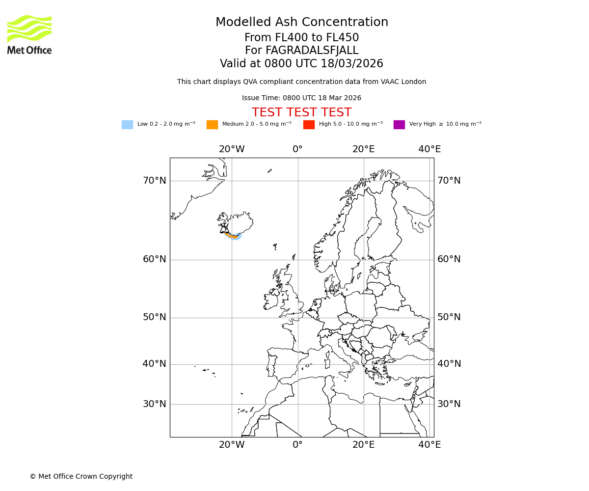 Modelled ash concentration from 450 to 500 for FAGRADALSFJALL. Valid at 0800 UTC 18/03/2026