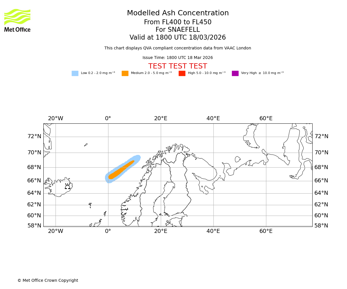 Modelled ash concentration from 450 to 500 for SNAEFELL. Valid at 1800 UTC 18/03/2026