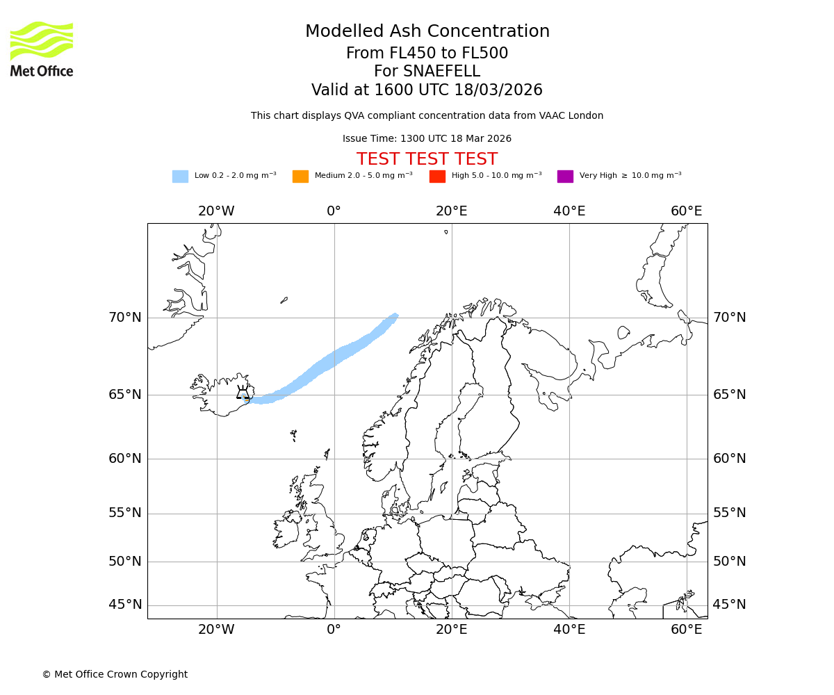 Modelled ash concentration from 450 to 500 for SNAEFELL. Valid at 1300 UTC 18/03/2026