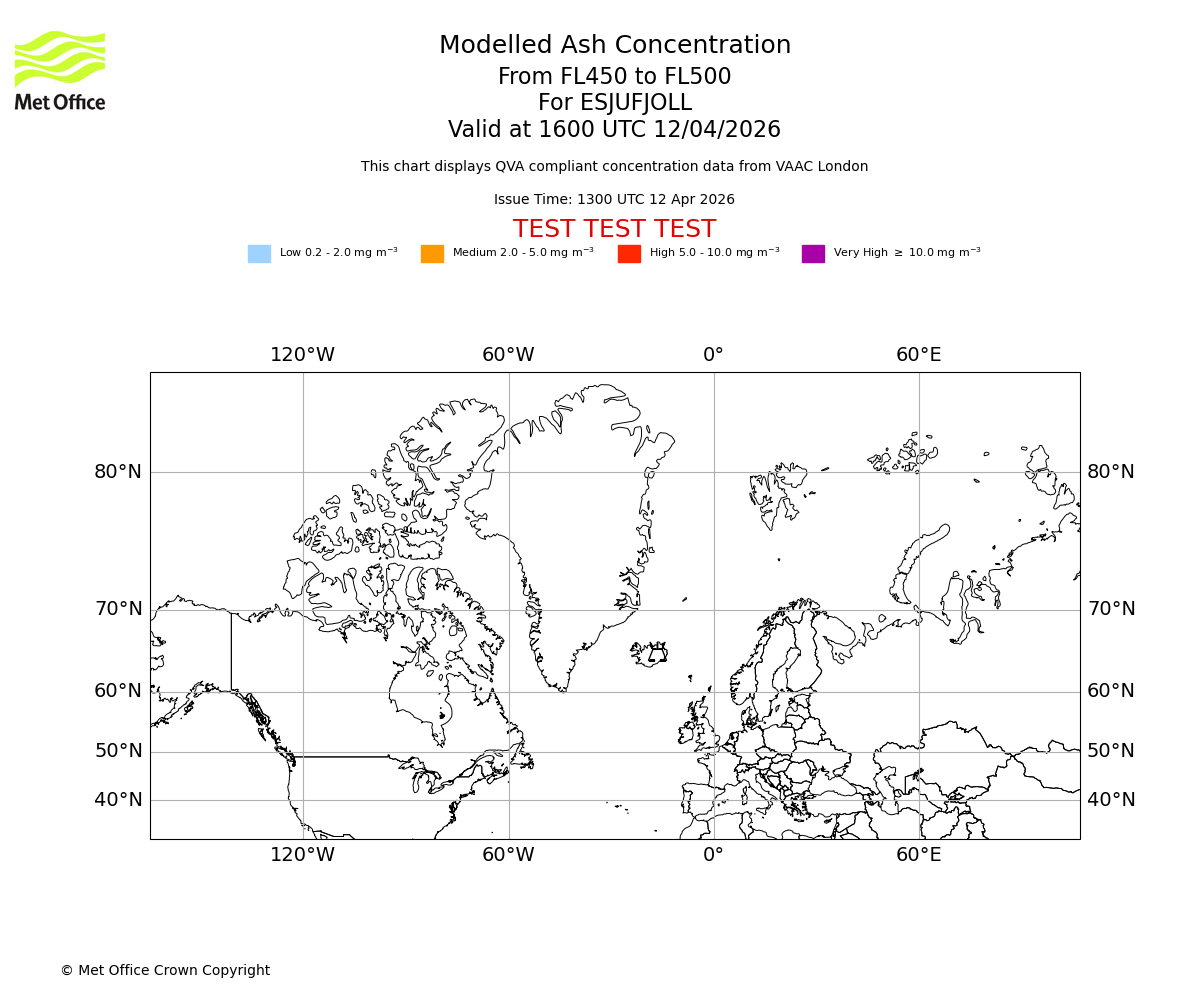 Modelled ash concentration from 450 to 500 for ESJUFJOLL. Valid at 1300 UTC 12/04/2026
