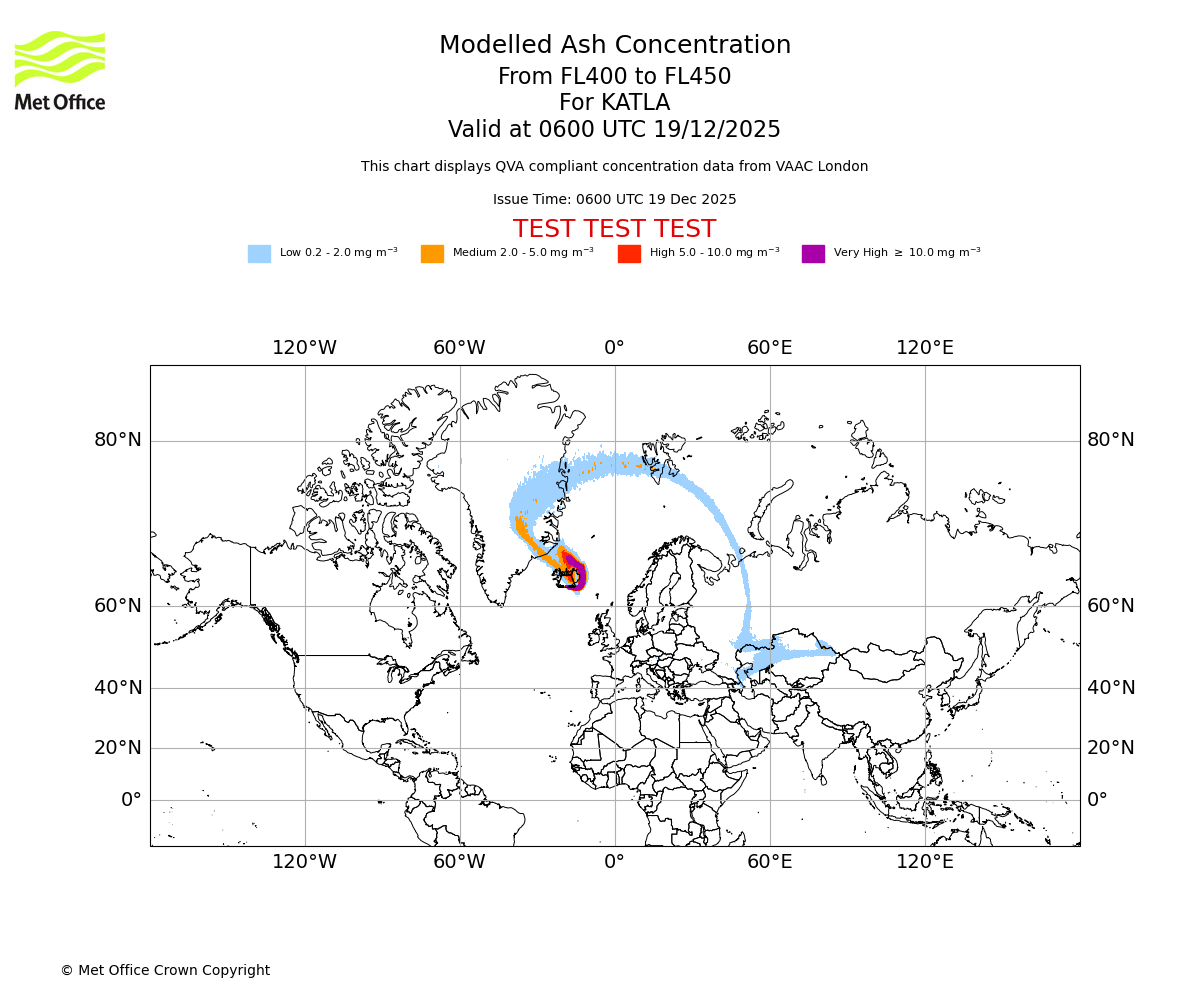 Modelled ash concentration from 000 to 200 for KATLA. Valid at 0600 UTC 19/12/2025