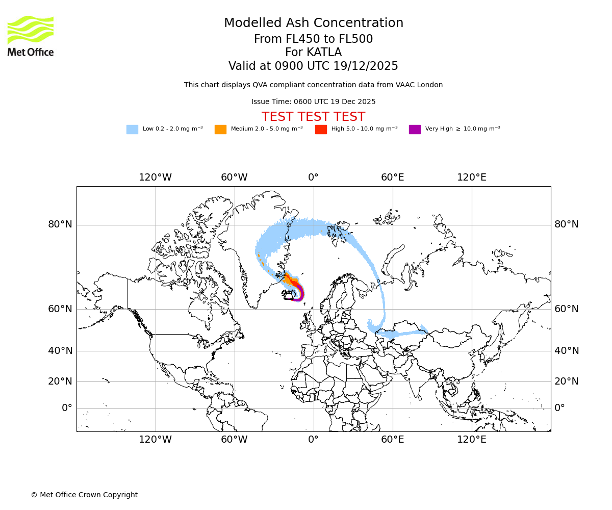 Modelled ash concentration from 450 to 500 for KATLA. Valid at 0600 UTC 19/12/2025