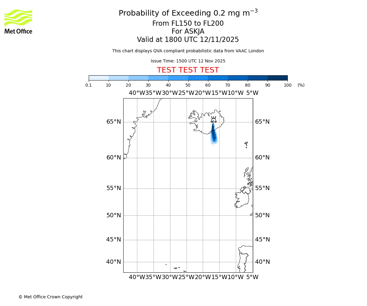In accordance with ICAO Annex 3, Amendment 82 VAAC London will provide operational QVA forecasts from 27 November 2025 and these will be made available via a VAAC London QVA API information service. These charts are currently provided for test and evaluation purposes (not for operational use) until the introduction of the operational service.