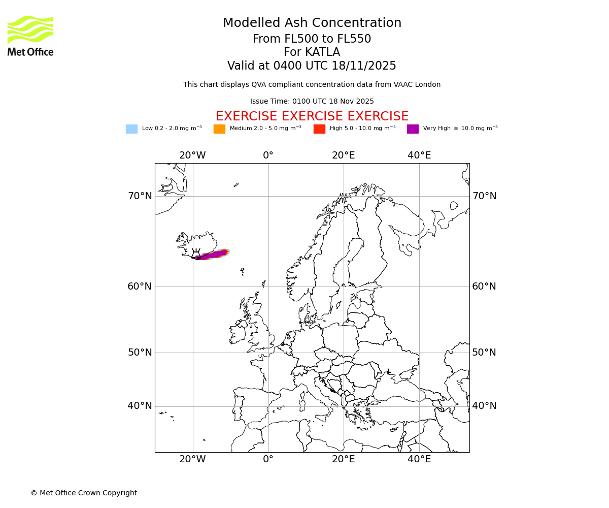 Modelled ash concentration from 500 to 550 for KATLA. Valid at 0100 UTC 18/11/2025