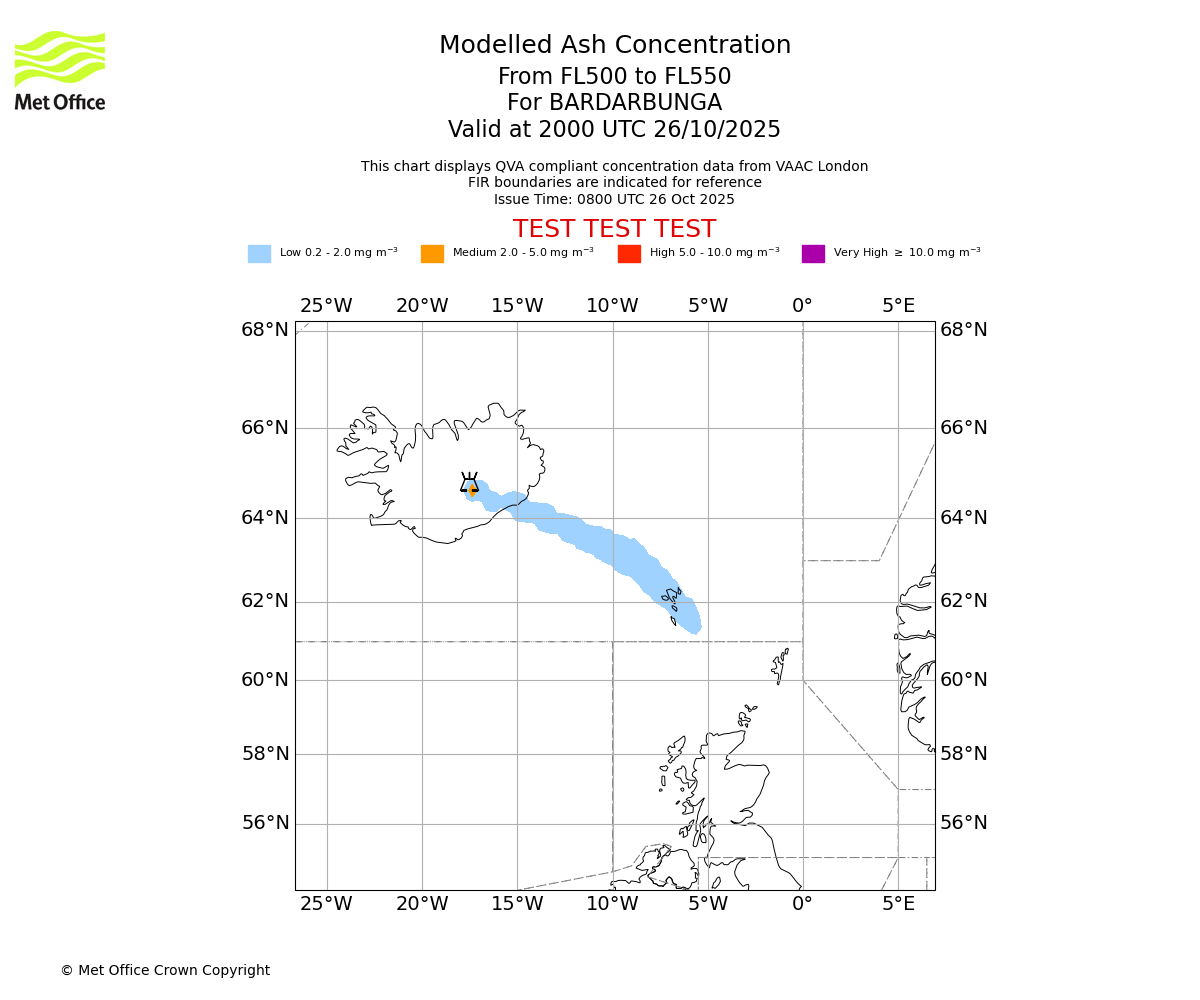 Modelled ash concentration from 500 to 550 for BARDARBUNGA. Valid at 1700 UTC 26/10/2025