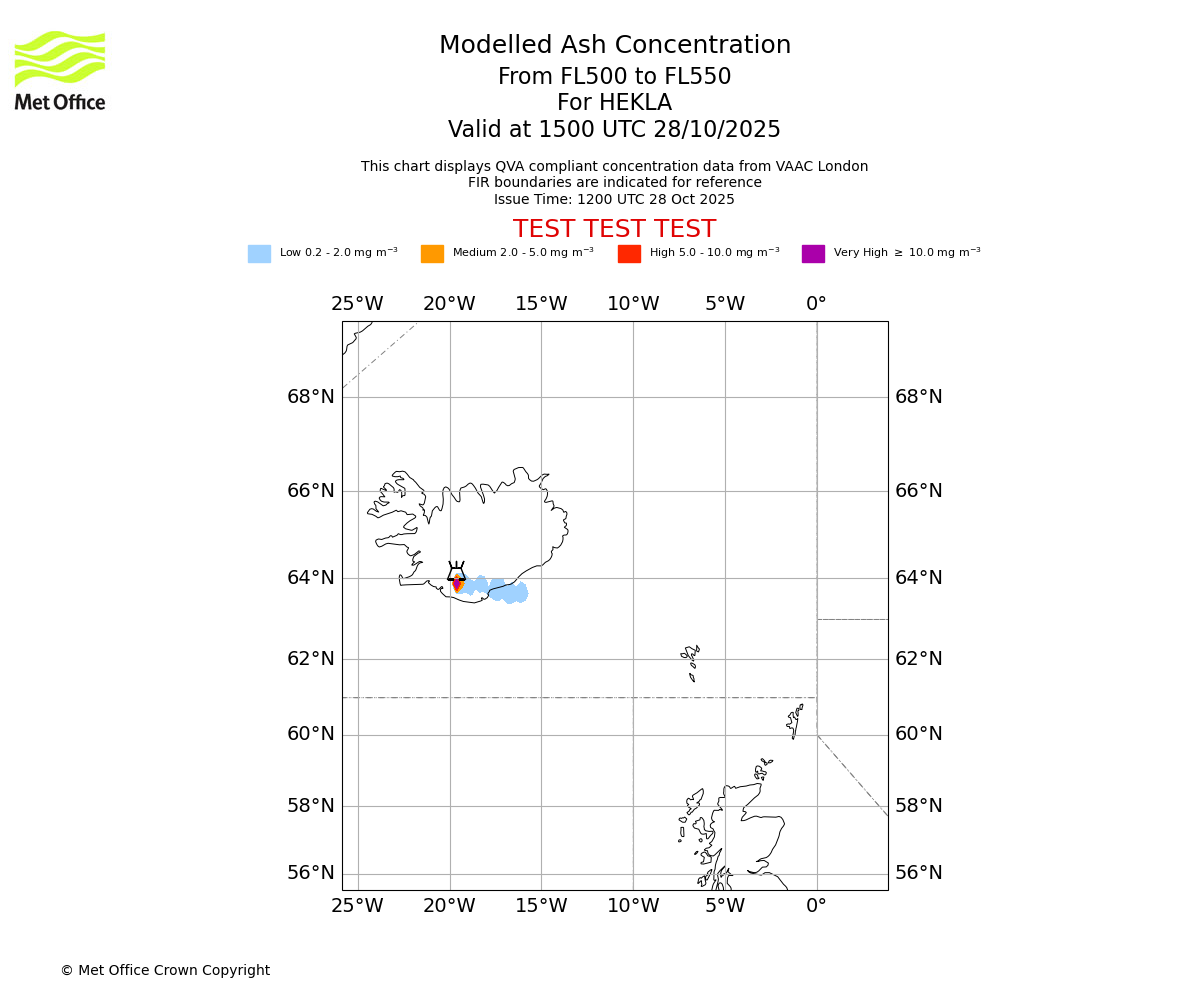 Modelled ash concentration from 500 to 550 for HEKLA. Valid at 1200 UTC 28/10/2025