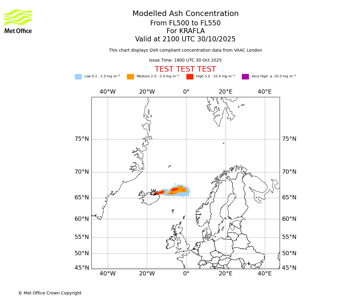 Modelled ash concentration from 500 to 550 for KRAFLA. Valid at 1800 UTC 30/10/2025