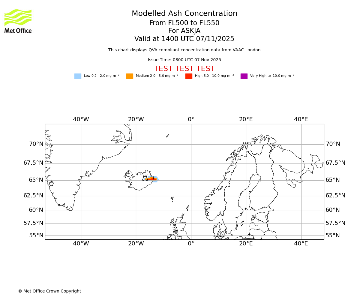Modelled ash concentration from 500 to 550 for ASKJA. Valid at 1100 UTC 07/11/2025