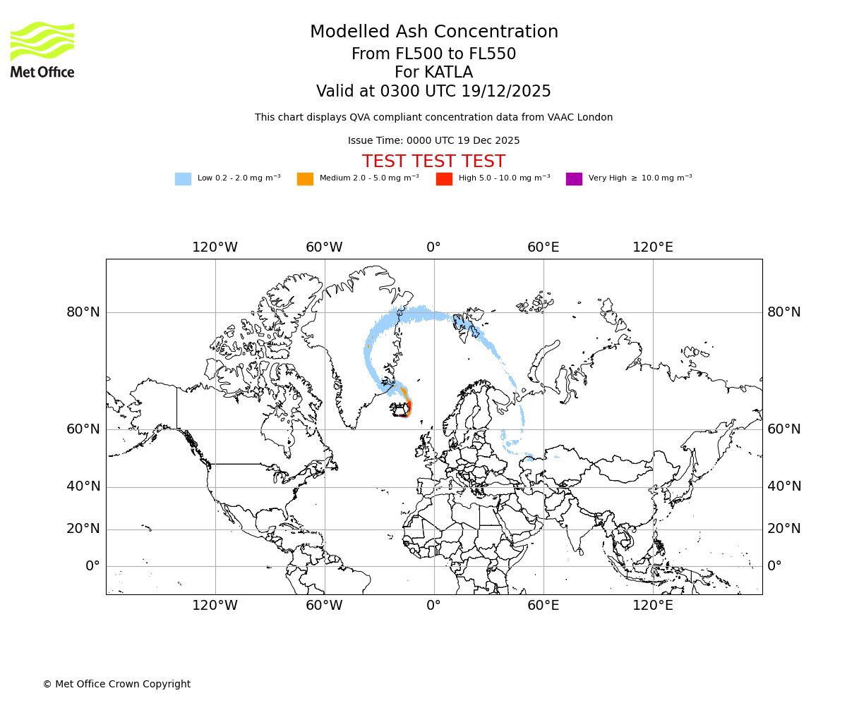 Modelled ash concentration from 500 to 550 for KATLA. Valid at 0000 UTC 19/12/2025