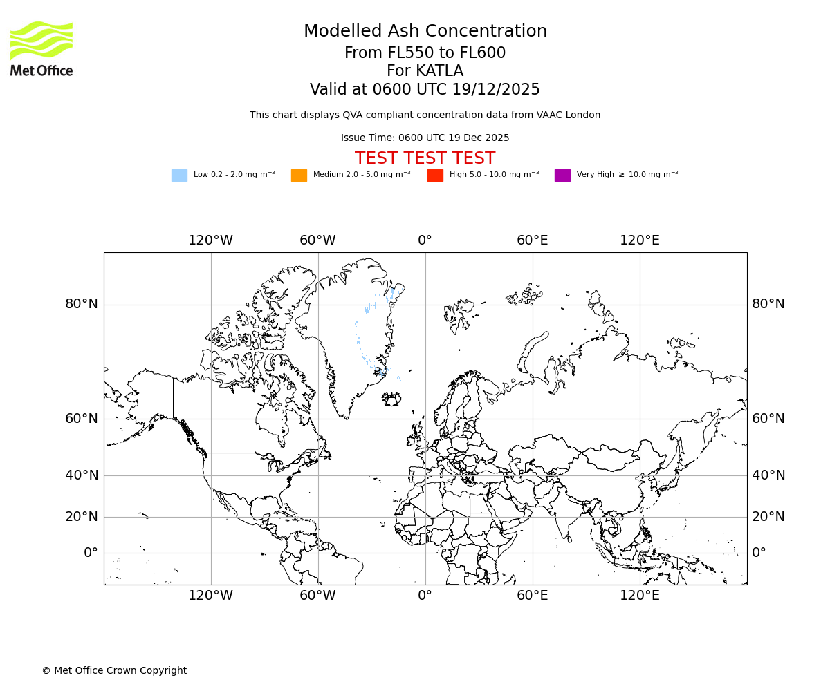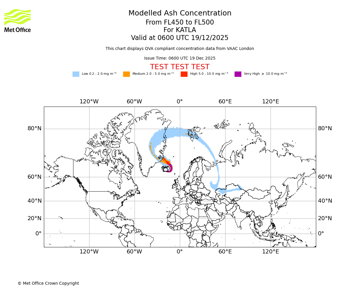 Modelled ash concentration from 000 to 200 for KATLA. Valid at 0600 UTC 19/12/2025