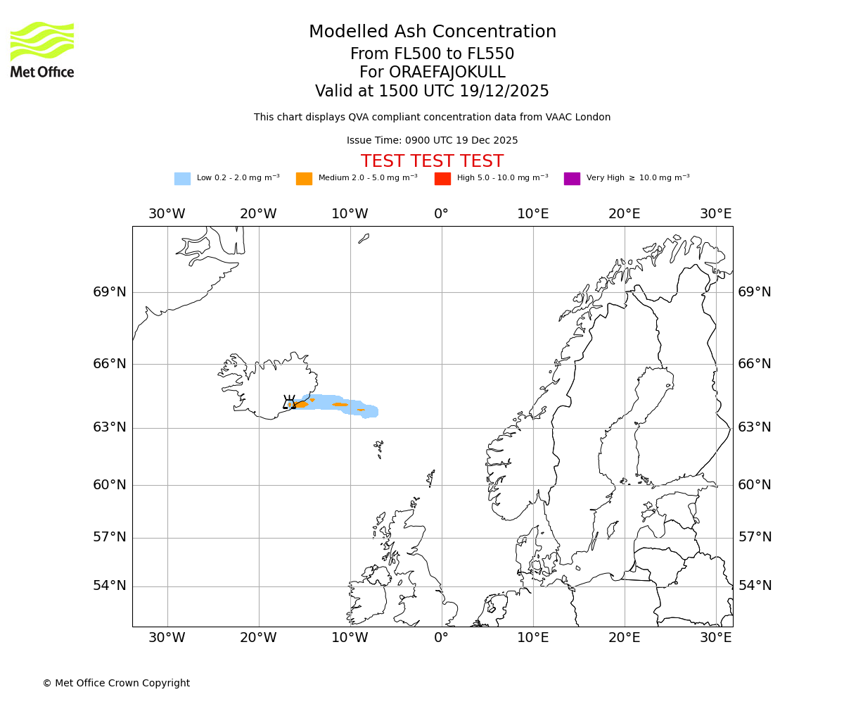 Modelled ash concentration from 500 to 550 for ORAEFAJOKULL. Valid at 1200 UTC 19/12/2025