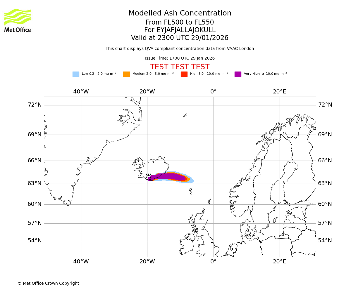Modelled ash concentration from 500 to 550 for EYJAFJALLAJOKULL. Valid at 2000 UTC 29/01/2026