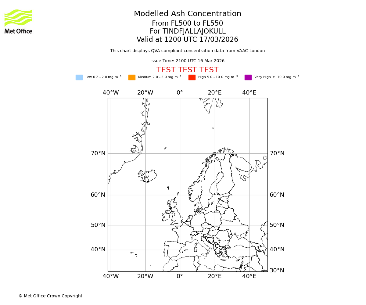 Modelled ash concentration from 500 to 550 for TINDFJALLAJOKULL. Valid at 0900 UTC 17/03/2026