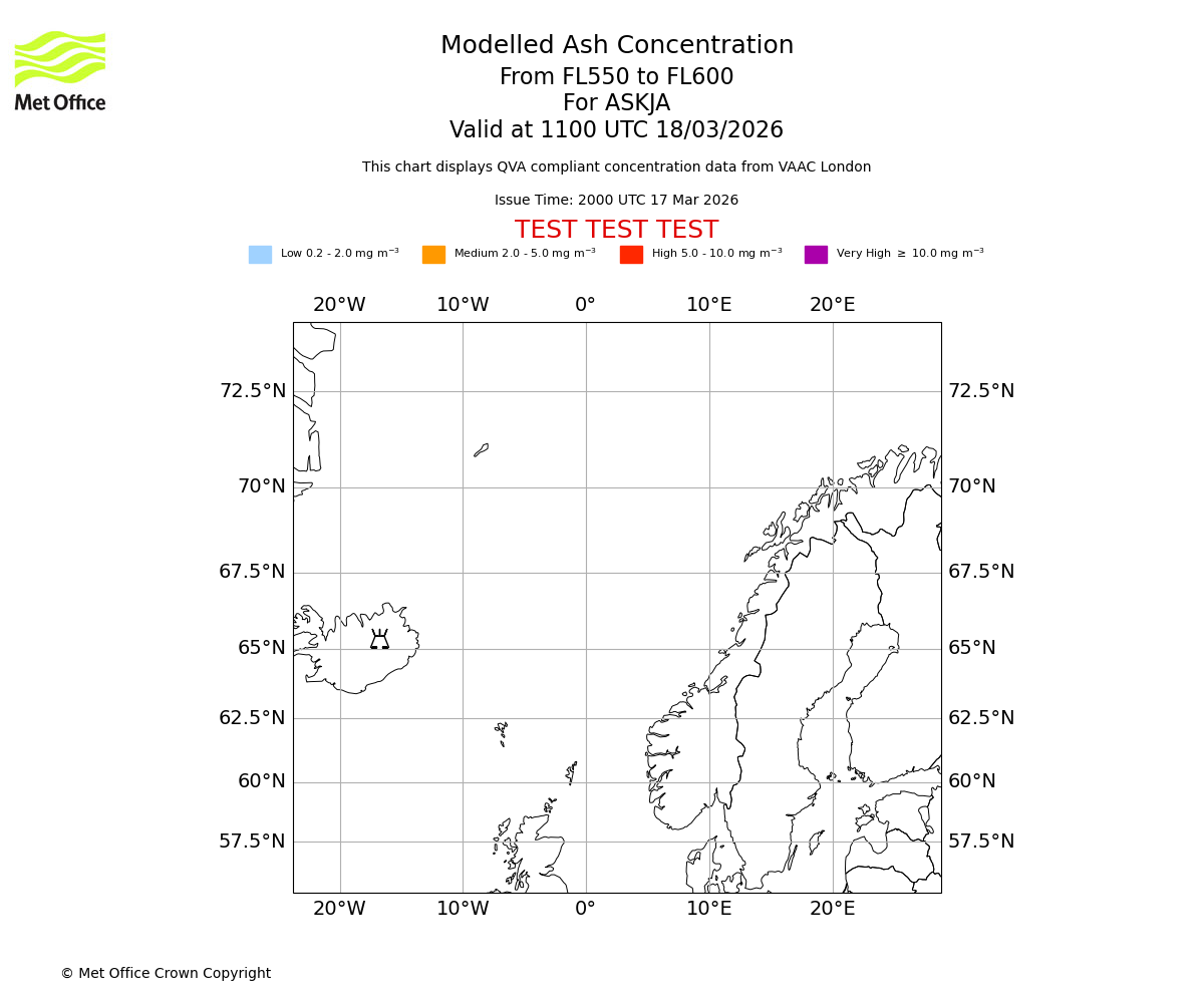 Modelled ash concentration from 500 to 550 for ASKJA. Valid at 1100 UTC 18/03/2026