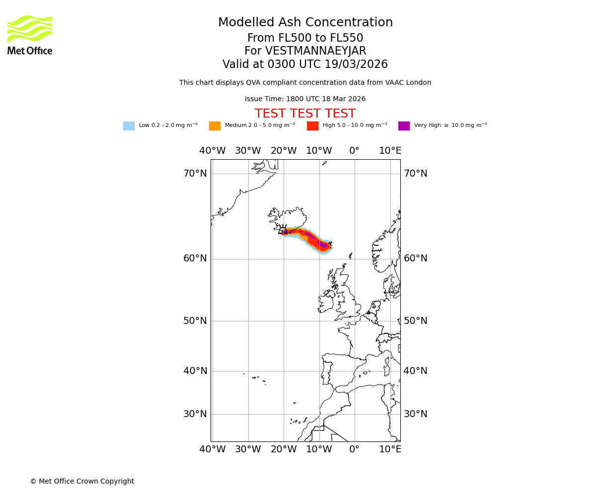 Modelled ash concentration from 500 to 550 for VESTMANNAEYJAR. Valid at 0000 UTC 19/03/2026