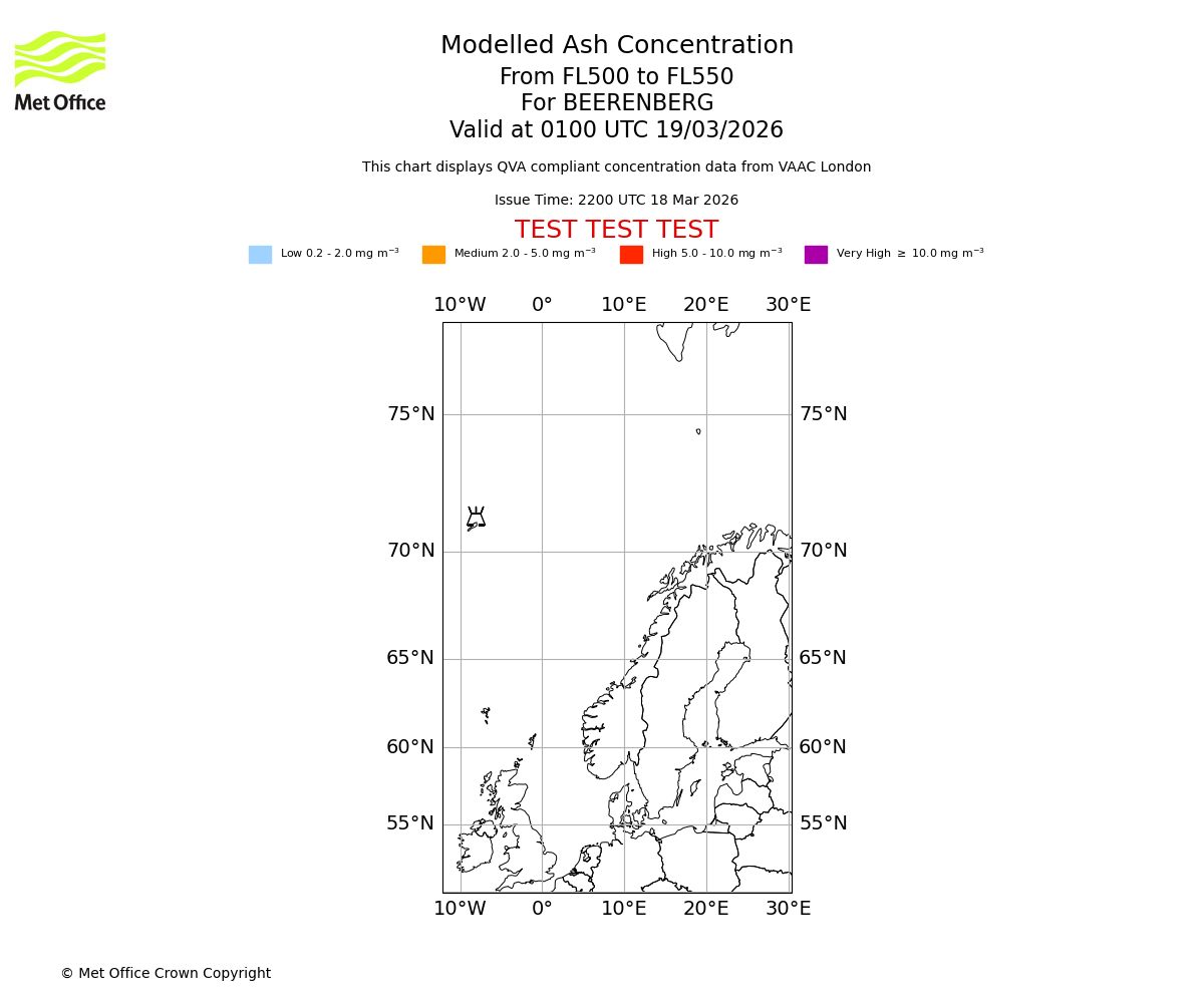 Modelled ash concentration from 500 to 550 for BEERENBERG. Valid at 2200 UTC 18/03/2026