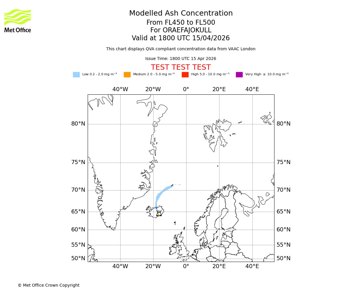 Modelled ash concentration from 500 to 550 for ORAEFAJOKULL. Valid at 1800 UTC 15/04/2026