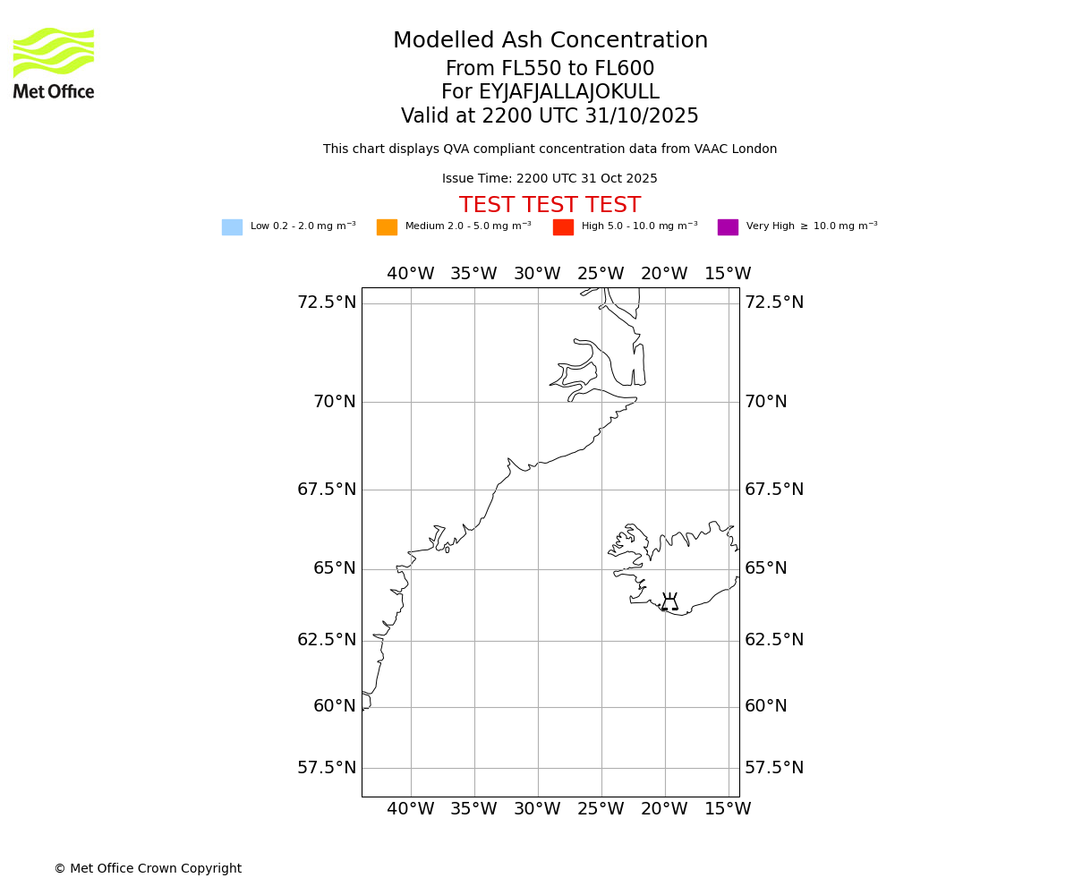 Modelled ash concentration from 500 to 550 for EYJAFJALLAJOKULL. Valid at 2200 UTC 31/10/2025