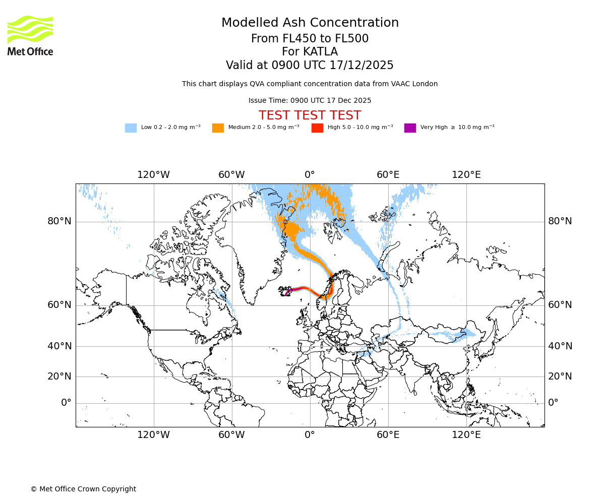 Modelled ash concentration from 500 to 550 for KATLA. Valid at 0900 UTC 17/12/2025