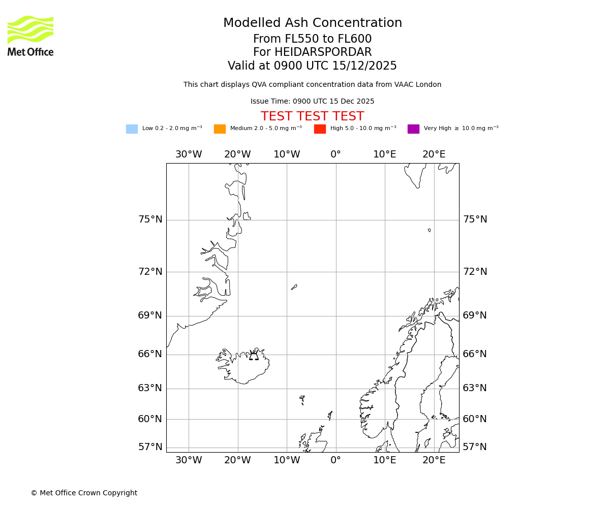 Modelled ash concentration from 500 to 550 for HEIDARSPORDAR. Valid at 0900 UTC 15/12/2025