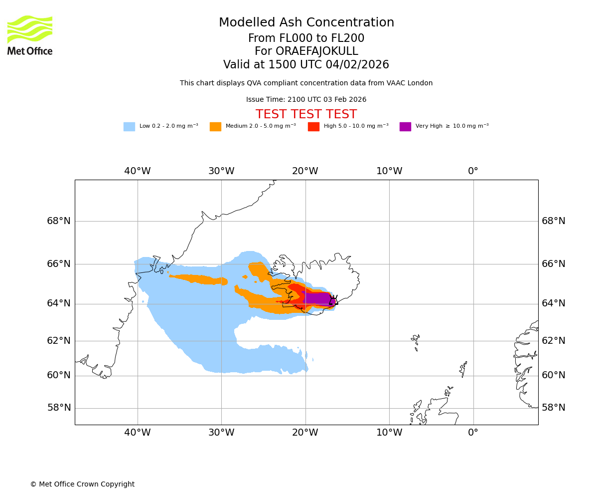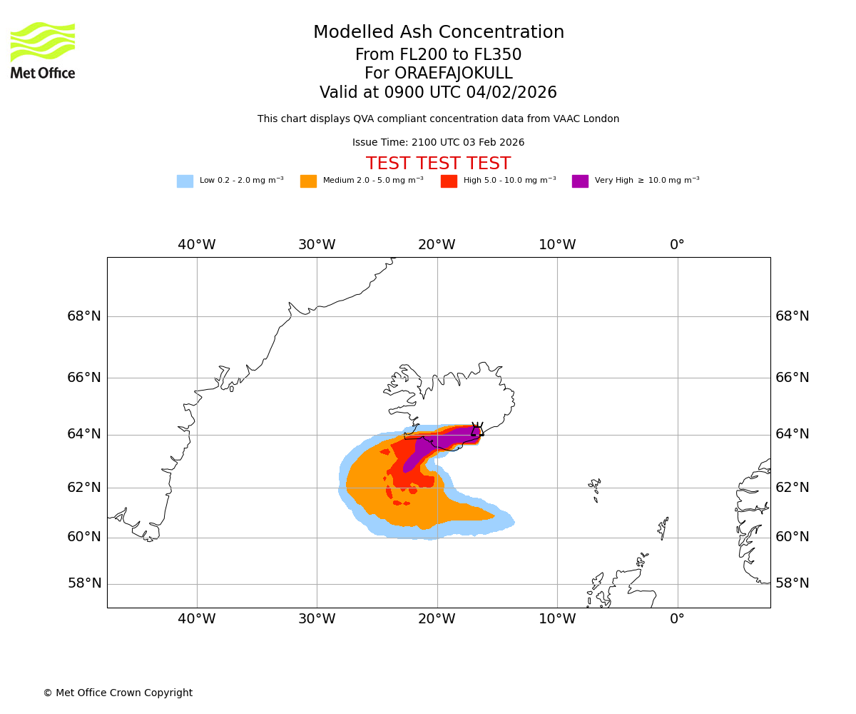Modelled ash concentration from 000 to 200 for ORAEFAJOKULL. Valid at 0900 UTC 04/02/2026