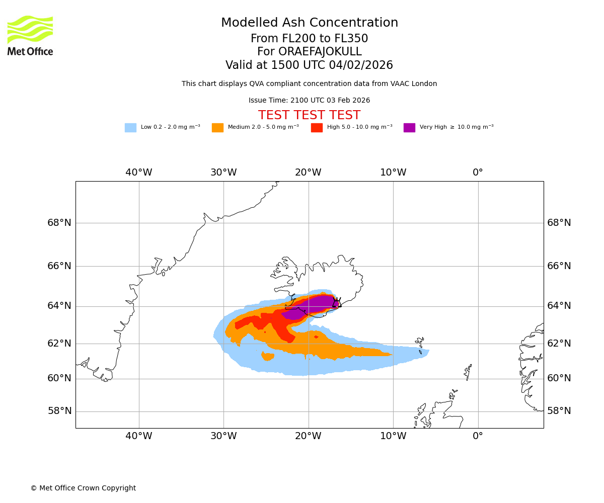 Modelled ash concentration from 000 to 200 for ORAEFAJOKULL. Valid at 1500 UTC 04/02/2026