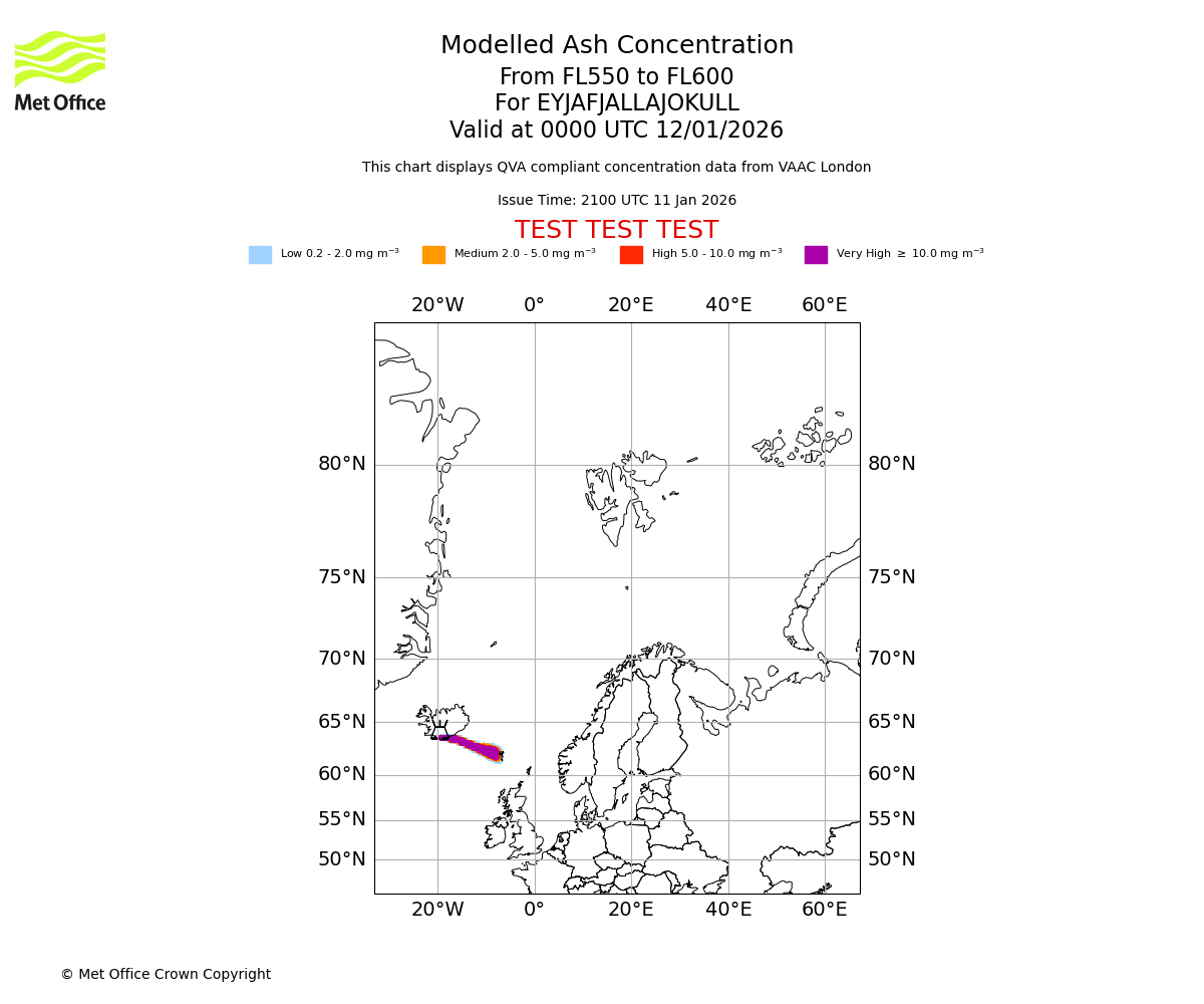 Modelled ash concentration from 550 to 600 for EYJAFJALLAJOKULL. Valid at 2100 UTC 11/01/2026