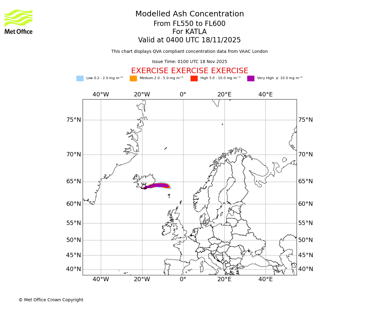 Modelled ash concentration from 550 to 600 for KATLA. Valid at 0100 UTC 18/11/2025