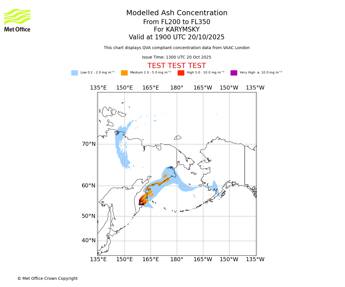 Modelled ash concentration from 000 to 200 for KARYMSKY. Valid at 1900 UTC 20/10/2025
