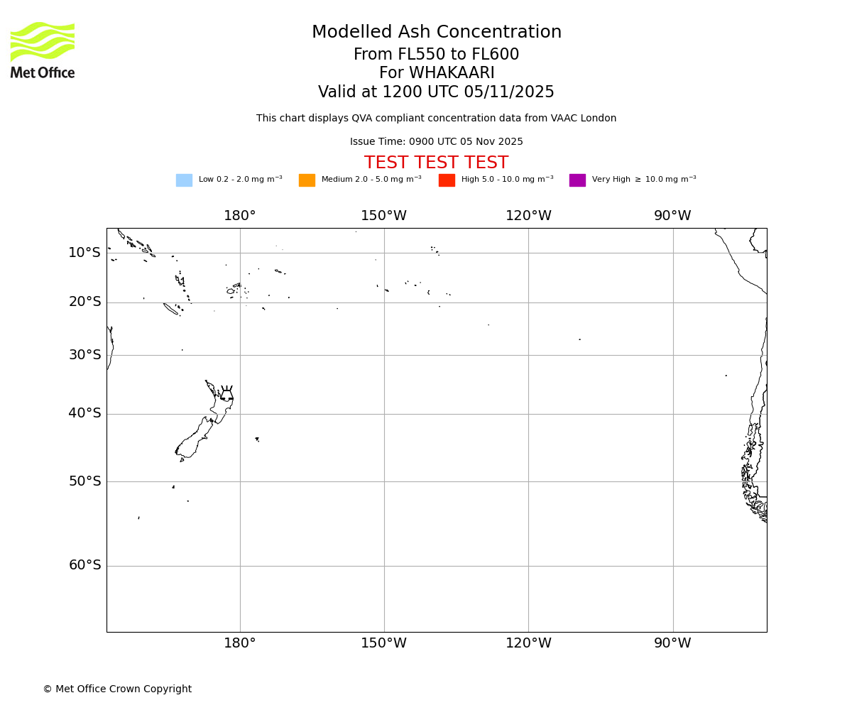 Modelled ash concentration from 550 to 600 for WHAKAARI. Valid at 0900 UTC 05/11/2025