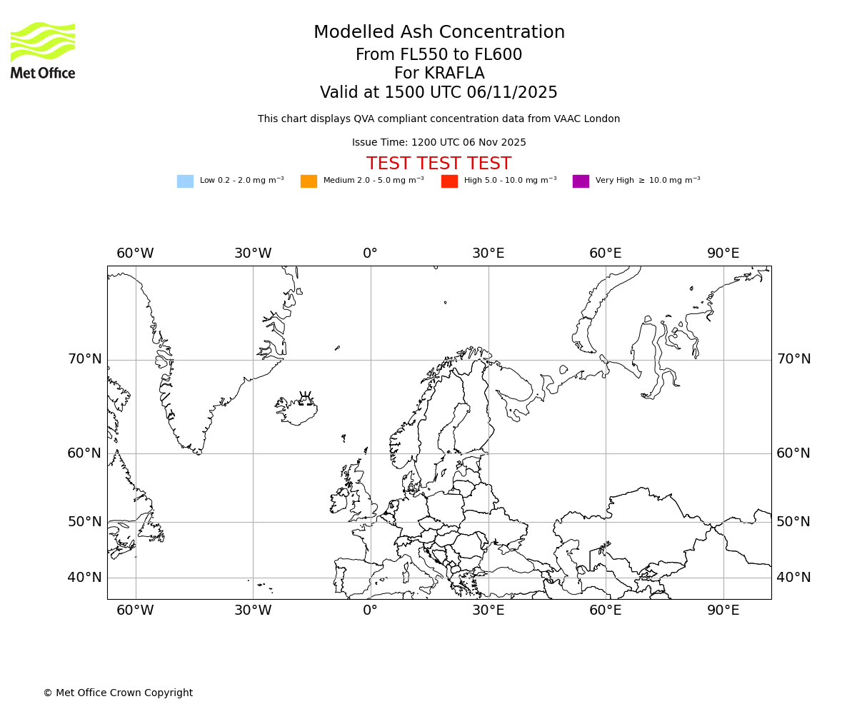 In accordance with ICAO Annex 3, Amendment 82 VAAC London will provide operational QVA forecasts from 27 November 2025 and these will be made available via a VAAC London QVA API information service. These charts are currently provided for test and evaluation purposes (not for operational use) until the introduction of the operational service.