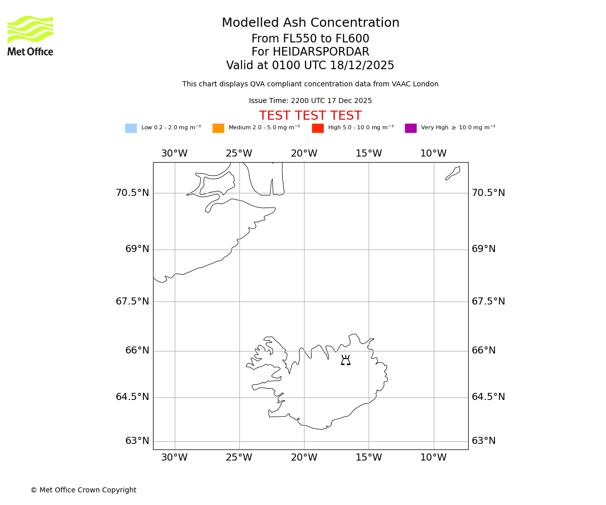 Modelled ash concentration from 550 to 600 for HEIDARSPORDAR. Valid at 2200 UTC 17/12/2025