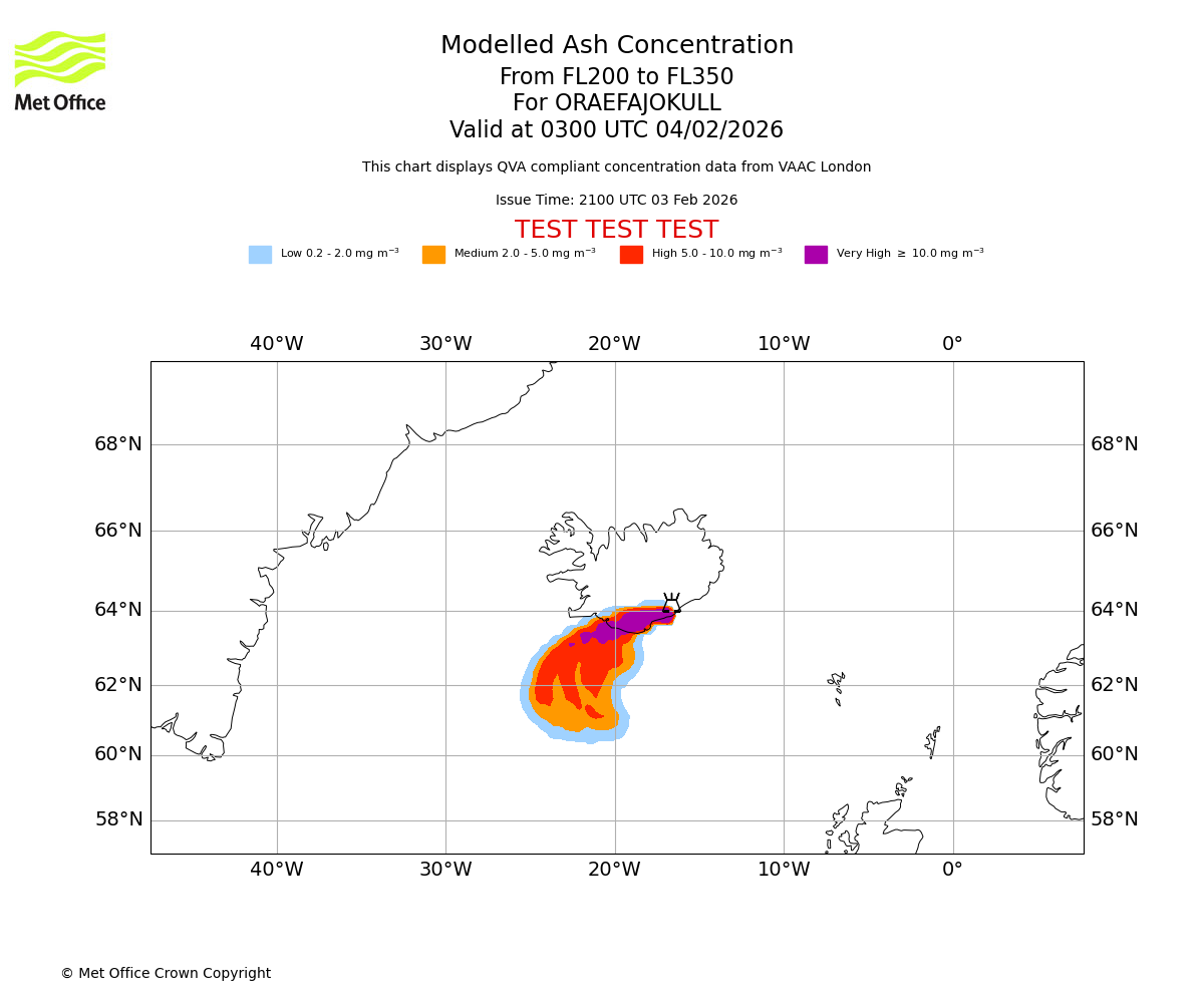 Modelled ash concentration from 000 to 200 for ORAEFAJOKULL. Valid at 0300 UTC 04/02/2026