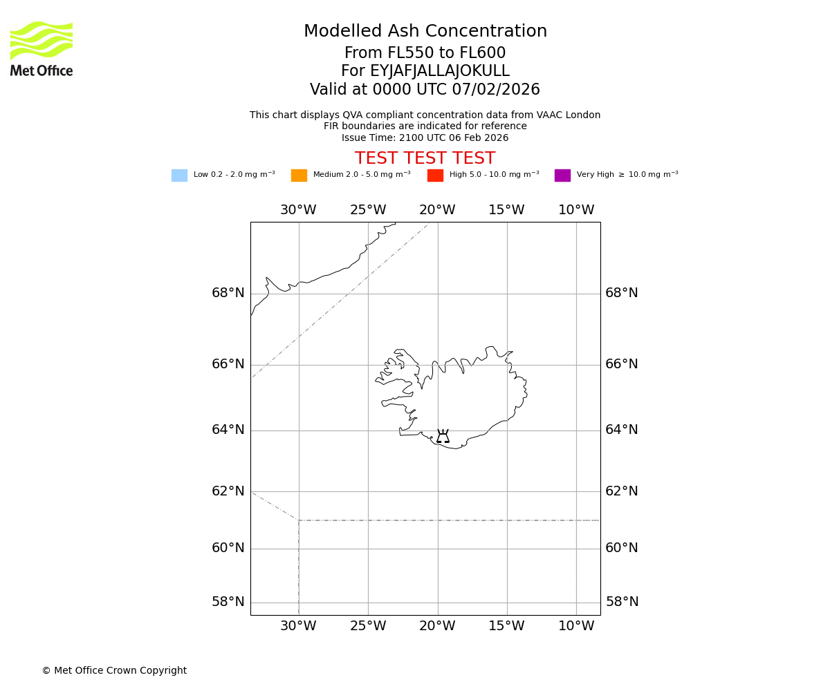 Modelled ash concentration from 550 to 600 for EYJAFJALLAJOKULL. Valid at 2100 UTC 06/02/2026