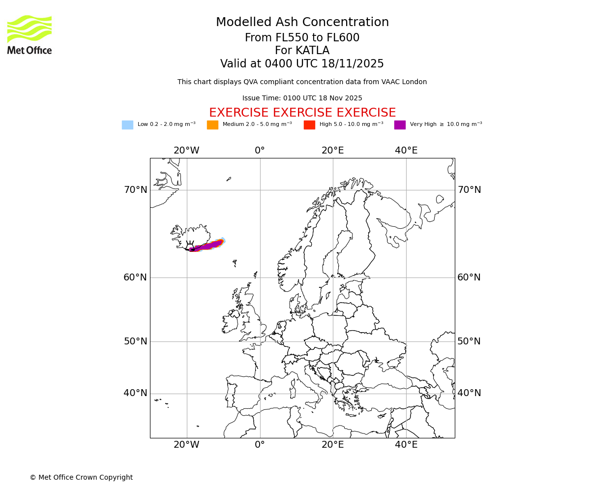 Modelled ash concentration from 550 to 600 for KATLA. Valid at 0100 UTC 18/11/2025