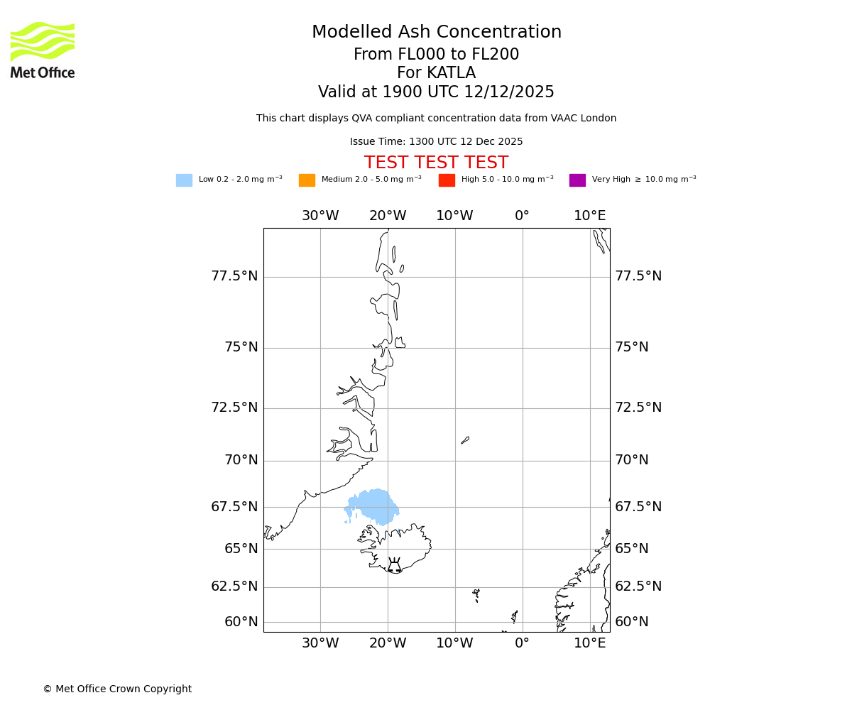 Modelled ash concentration from 000 to 200 for KATLA. Valid at 1300 UTC 12/12/2025