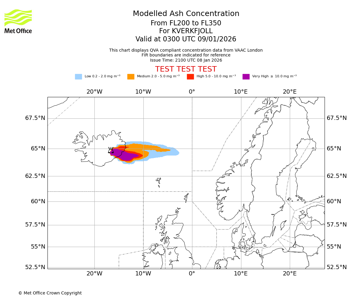 Modelled ash concentration from 200 to 350 for KVERKFJOLL. Valid at 2100 UTC 08/01/2026