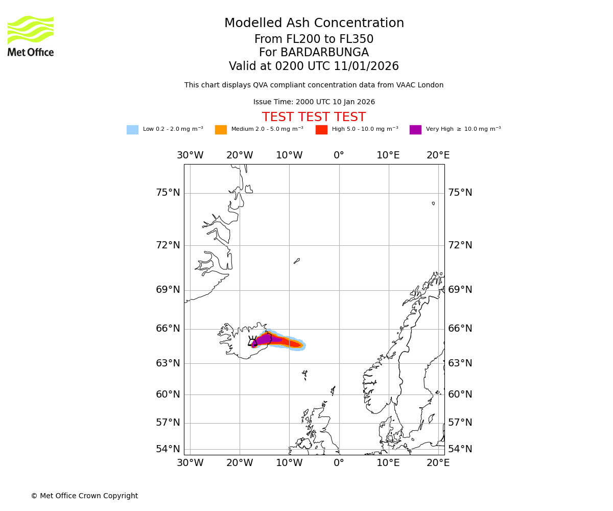 Modelled ash concentration from 200 to 350 for BARDARBUNGA. Valid at 2000 UTC 10/01/2026