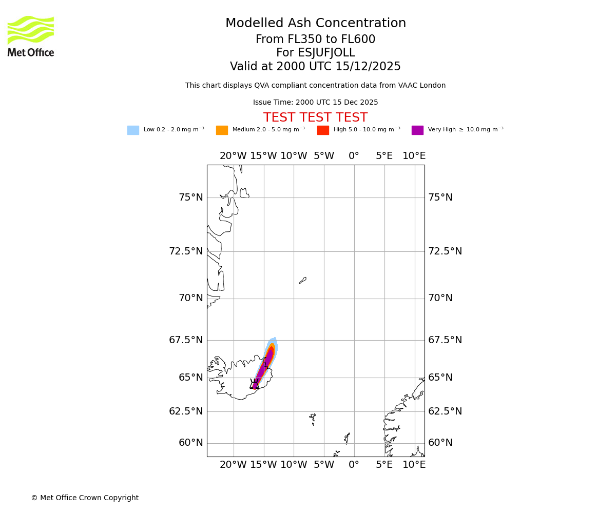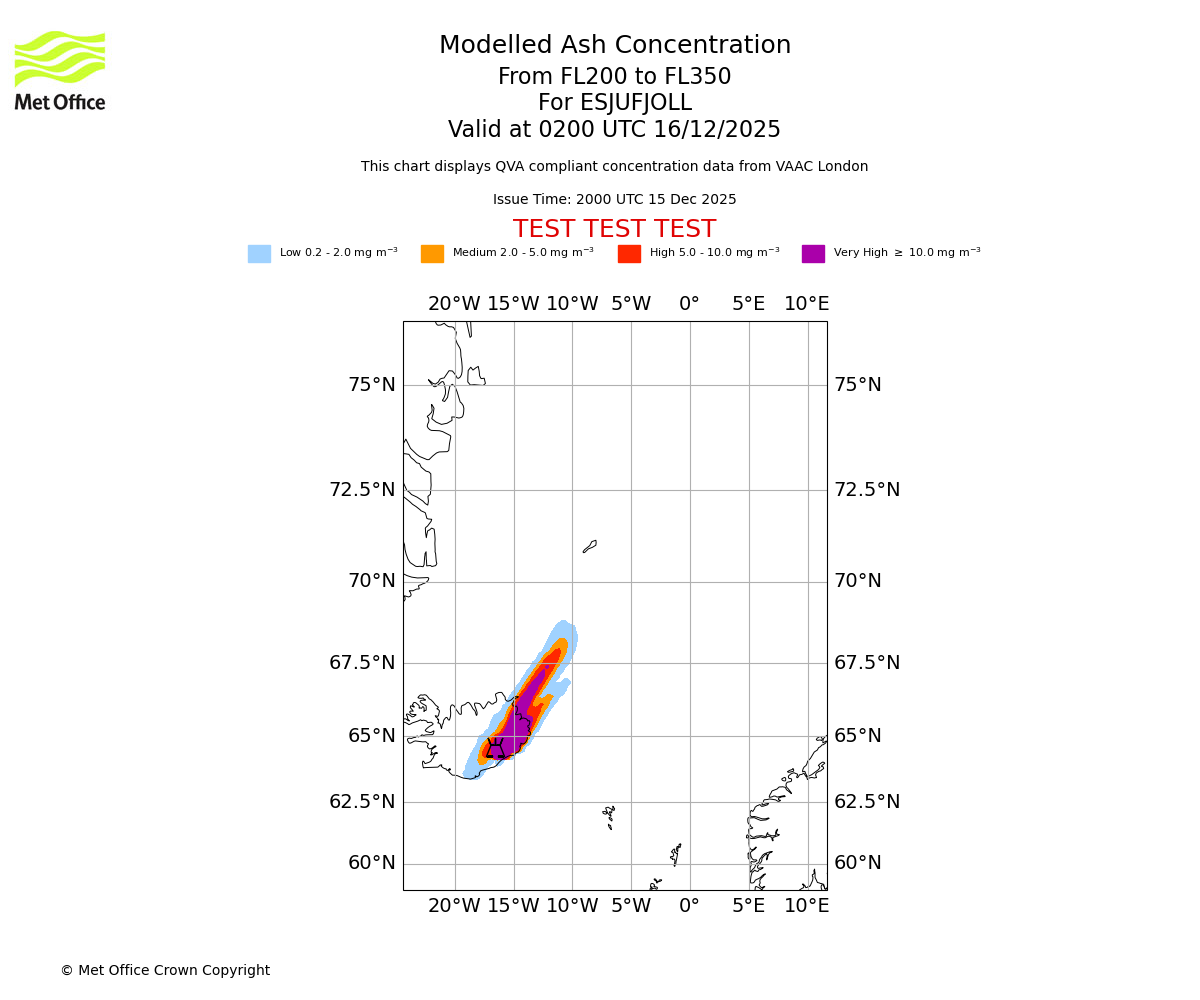 Modelled ash concentration from 200 to 350 for ESJUFJOLL. Valid at 2000 UTC 15/12/2025