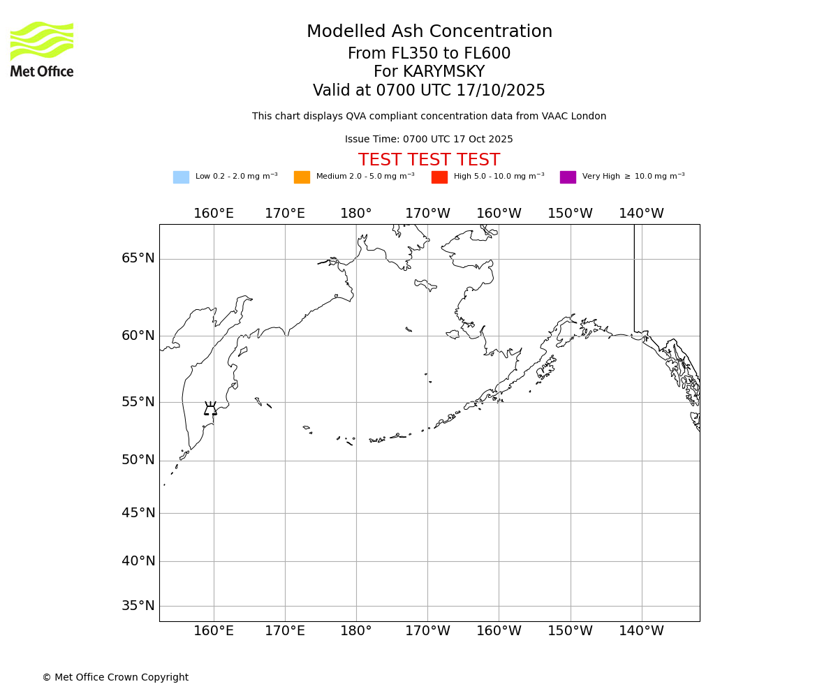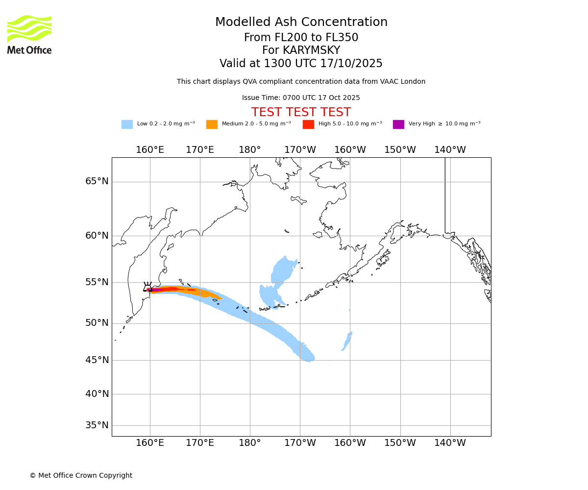 Modelled ash concentration from 200 to 350 for KARYMSKY. Valid at 0700 UTC 17/10/2025