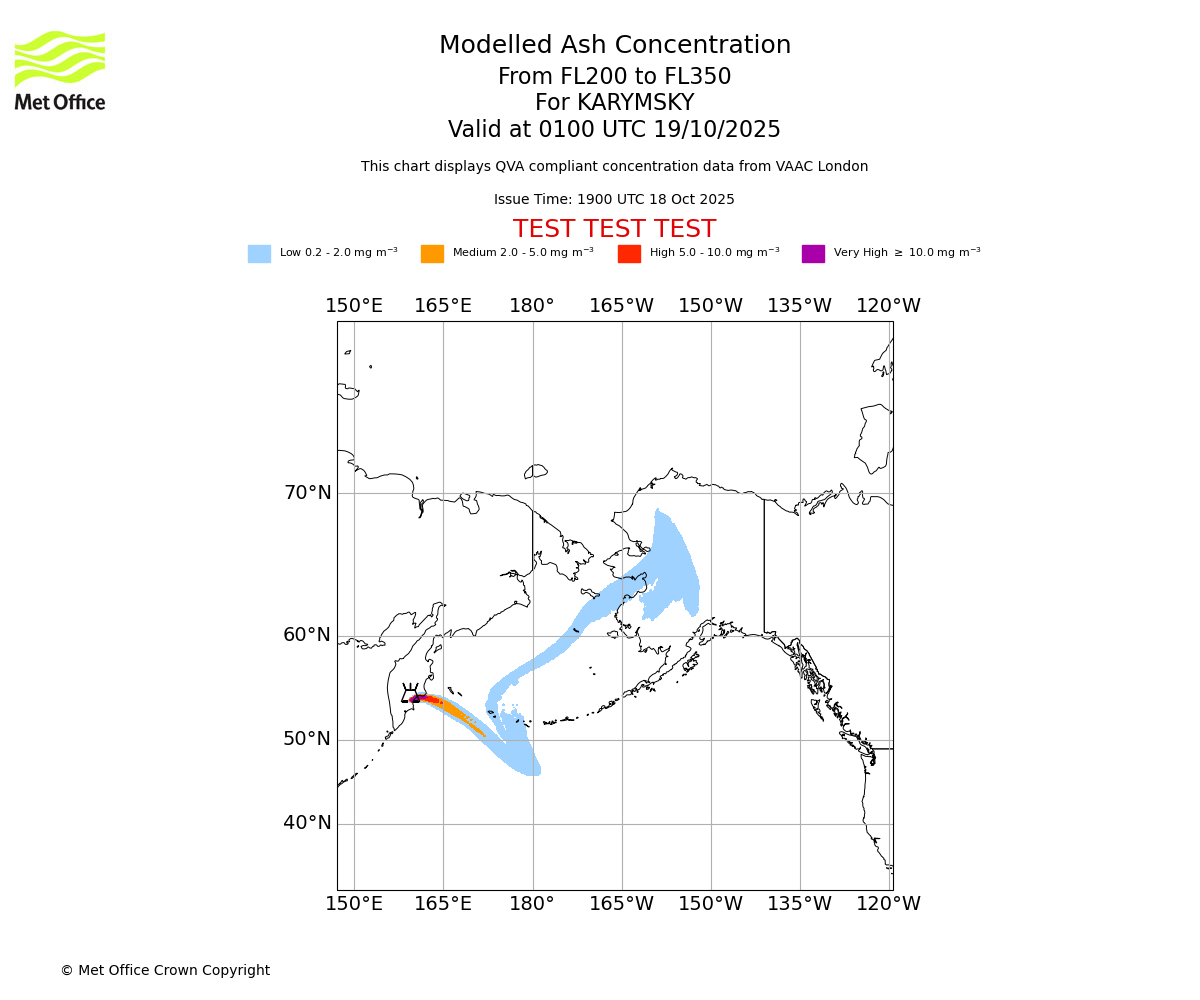 Modelled ash concentration from 200 to 350 for KARYMSKY. Valid at 1900 UTC 18/10/2025