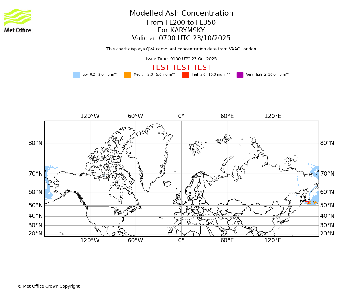 Modelled ash concentration from 200 to 350 for KARYMSKY. Valid at 0100 UTC 23/10/2025