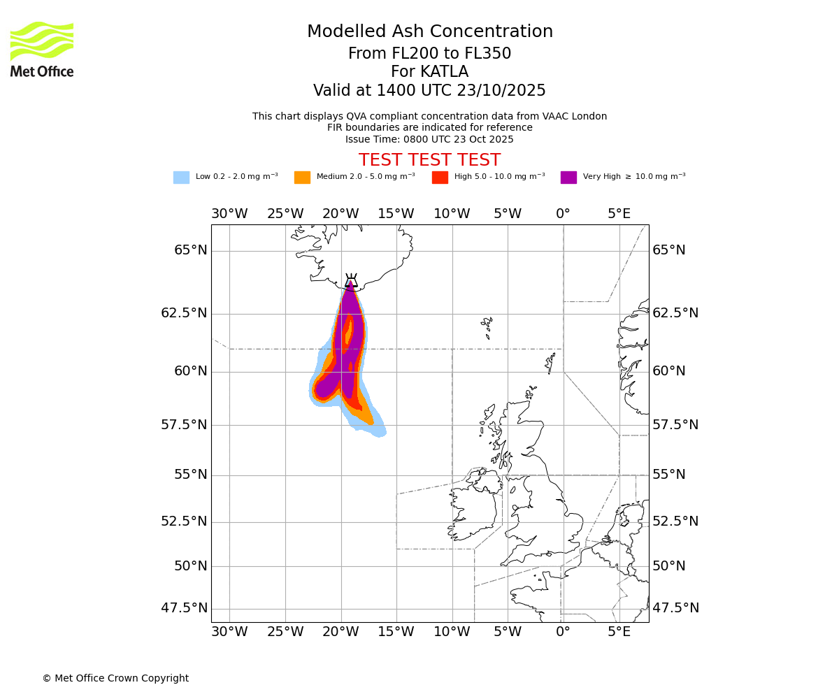 Modelled ash concentration from 200 to 350 for KATLA. Valid at 0800 UTC 23/10/2025