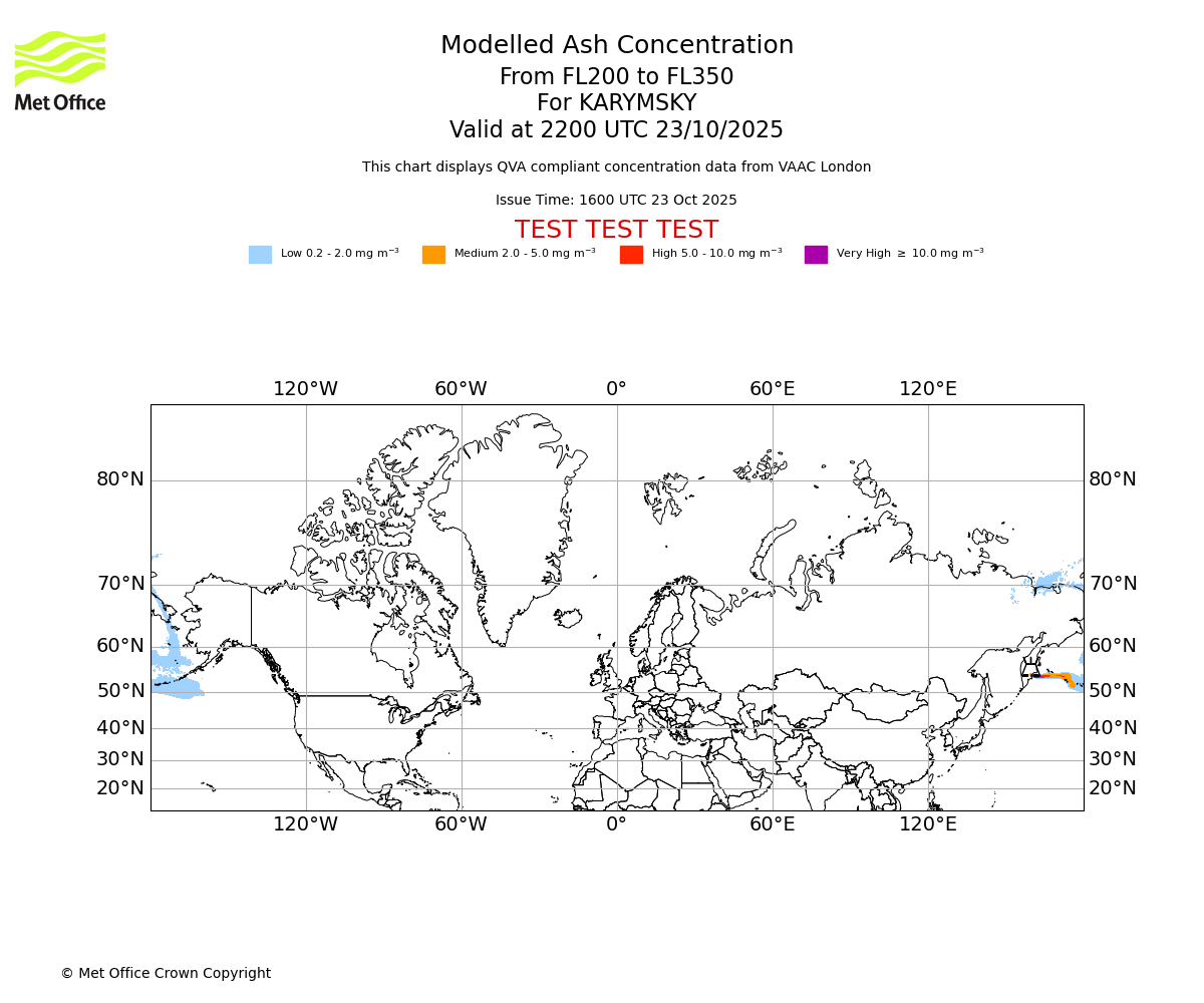 Modelled ash concentration from 200 to 350 for KARYMSKY. Valid at 1600 UTC 23/10/2025