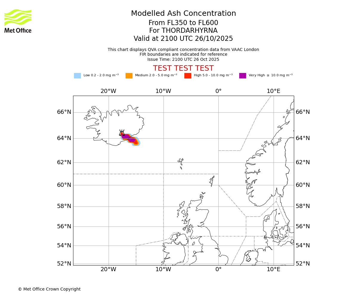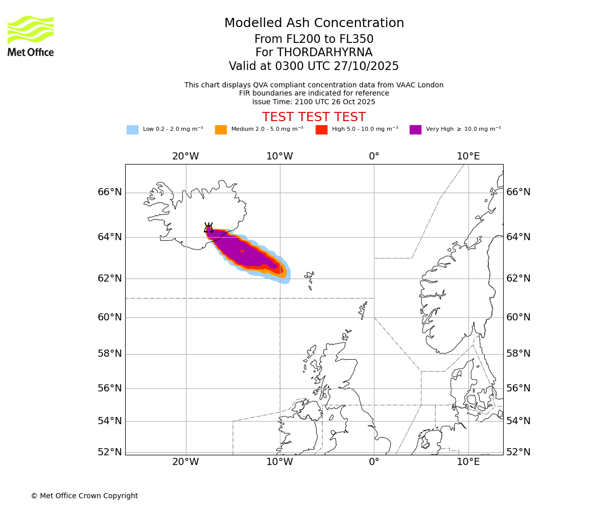 Modelled ash concentration from 200 to 350 for THORDARHYRNA. Valid at 2100 UTC 26/10/2025