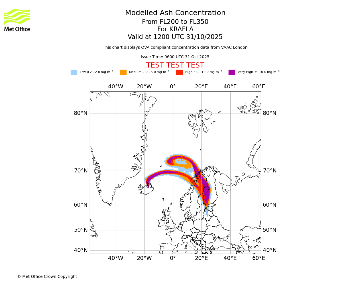 Modelled ash concentration from 200 to 350 for KRAFLA. Valid at 0600 UTC 31/10/2025