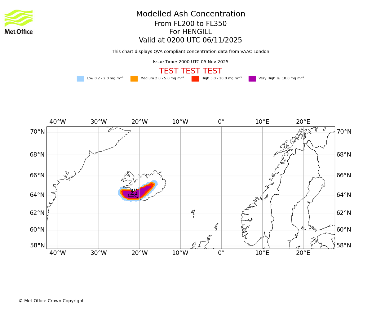 In accordance with ICAO Annex 3, Amendment 82 VAAC London will provide operational QVA forecasts from 27 November 2025 and these will be made available via a VAAC London QVA API information service. These charts are currently provided for test and evaluation purposes (not for operational use) until the introduction of the operational service.