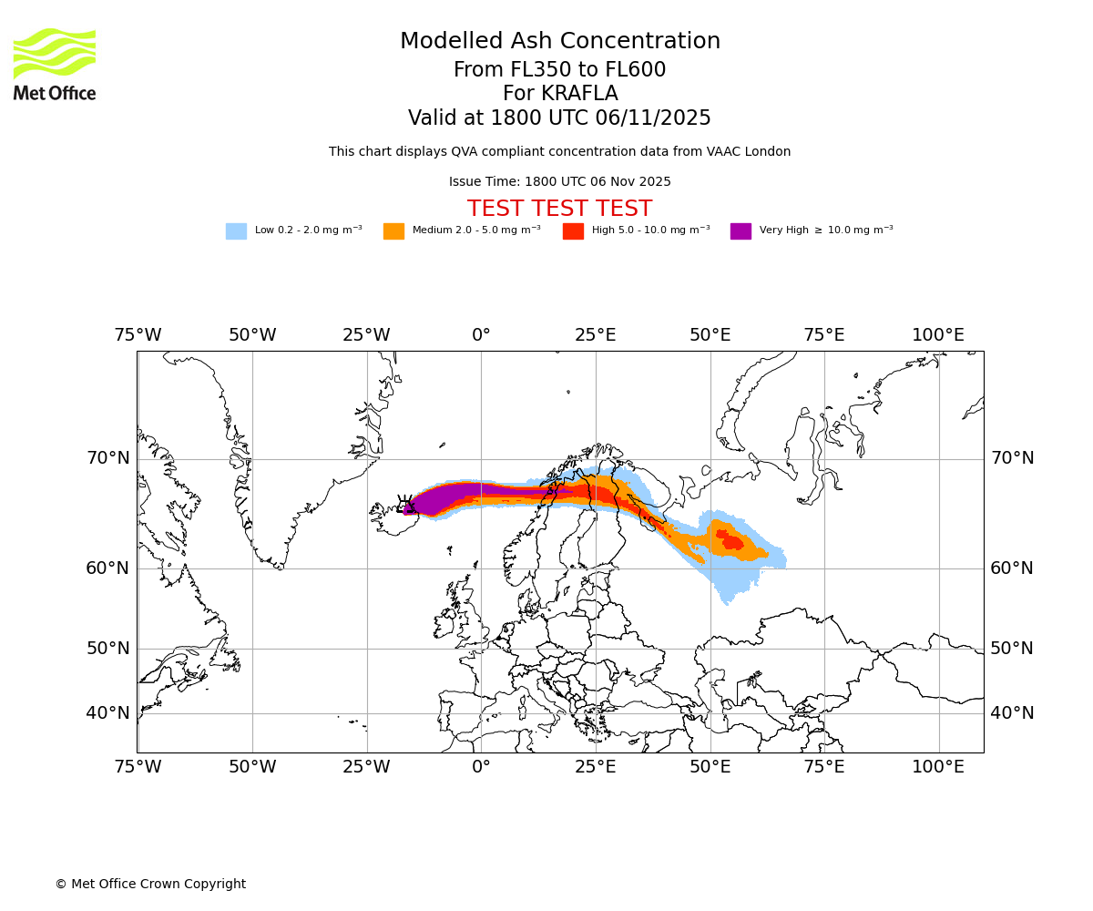 In accordance with ICAO Annex 3, Amendment 82 VAAC London will provide operational QVA forecasts from 27 November 2025 and these will be made available via a VAAC London QVA API information service. These charts are currently provided for test and evaluation purposes (not for operational use) until the introduction of the operational service.