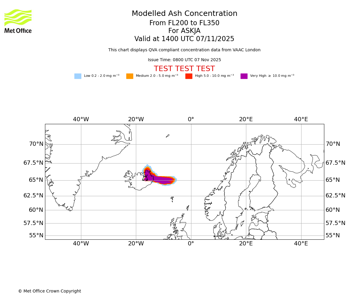 In accordance with ICAO Annex 3, Amendment 82 VAAC London will provide operational QVA forecasts from 27 November 2025 and these will be made available via a VAAC London QVA API information service. These charts are currently provided for test and evaluation purposes (not for operational use) until the introduction of the operational service.