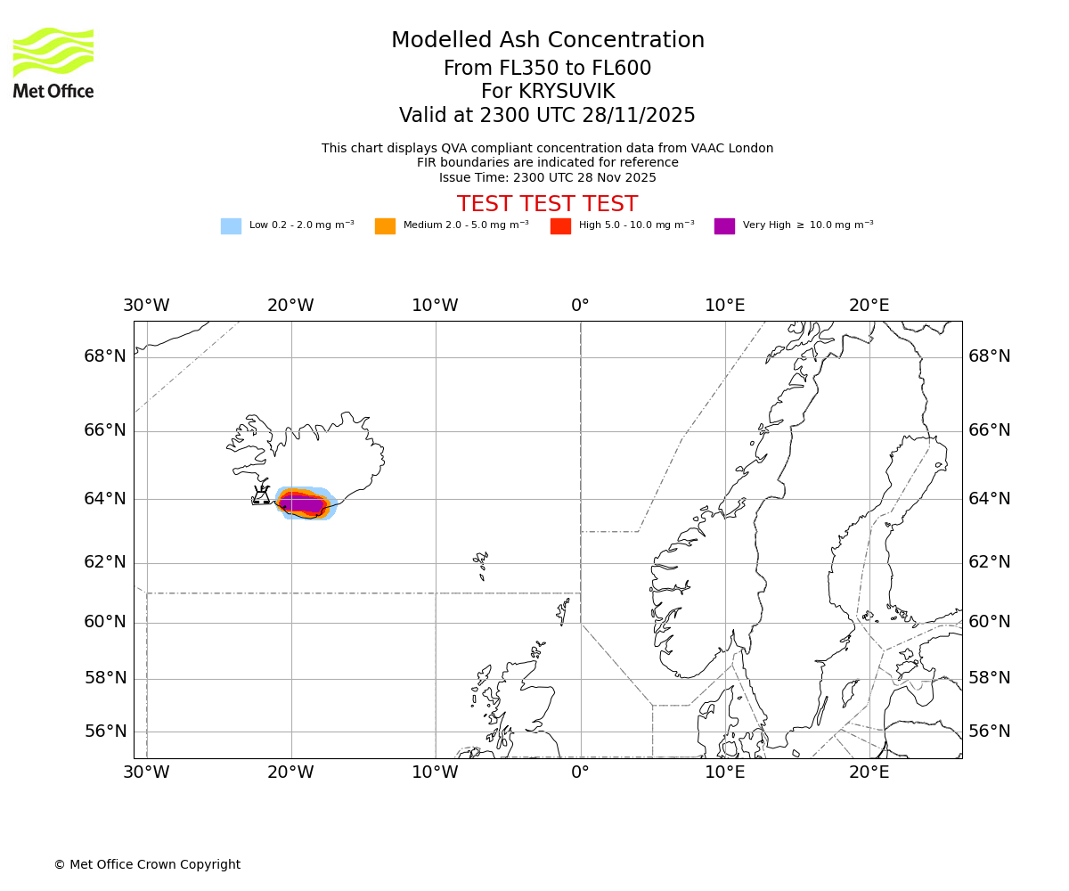 Modelled ash concentration from 200 to 350 for KRYSUVIK. Valid at 2300 UTC 28/11/2025